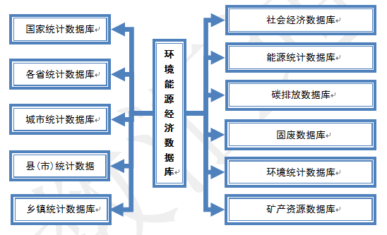 统计数据库以国家、省、地级市以及县(市)、乡镇的社会、经济、环境、资源等公开统计年鉴为基础,收录了1990年以来丰富且实用的基础数据,建立了最完整的公开数据库,包括了社会经济、能源统计、碳排放、环境统计、农业、水资源、矿产资源、林业与生态等,具体如下图: